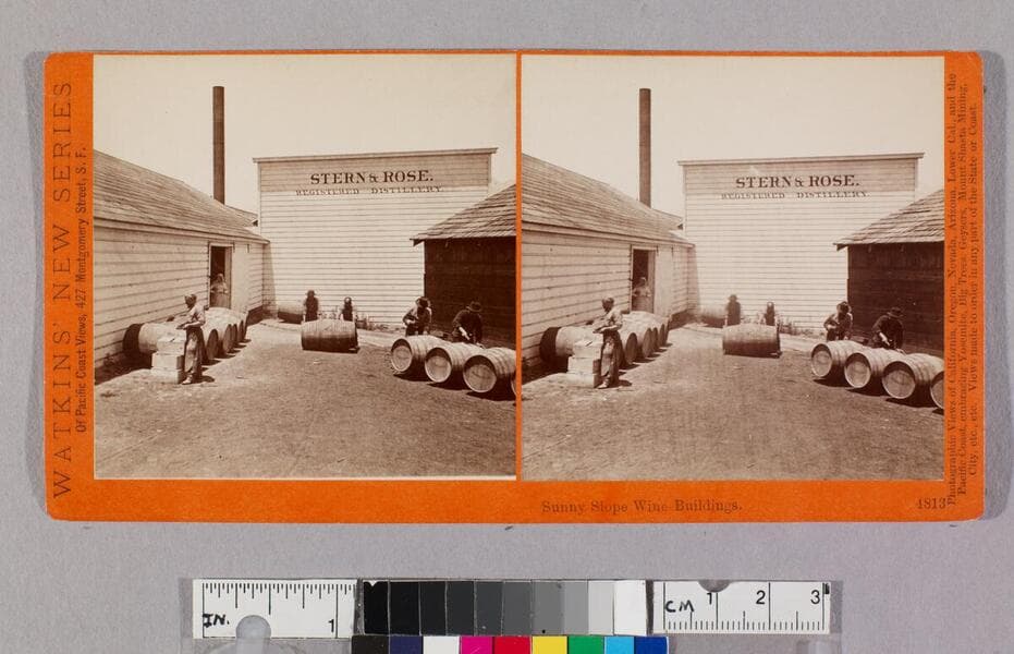 Winery employees work with wooden crates and barrels in an open space between three winery outbuildings on the Sunny Slope ranch owned by L. J. Rose in San Gabriel, California. A woman stands in the open doorway of the building on the left. Lettering on the side of center building reads: "Stern & Rose, Registered Distillery."
