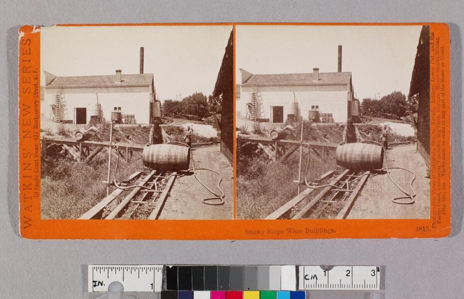Several winery buildings set atop a hill and along the hillside at the Sunny Slope ranch owned by L. J. Rose in San Gabriel, California, including the Stern & Rose distillery. Workers are scattered among the buildings and road leading up the hill. Wine barrels fill the opening of one of the buildings.