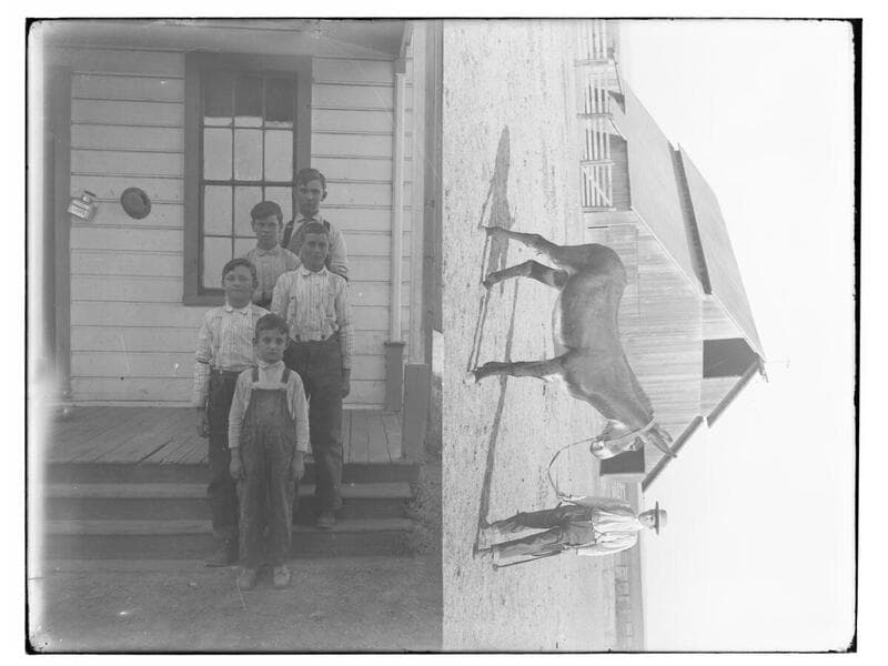 Glass plate with a group portrait of school children in front of the one room Hopeton School in Merced County. There are six young boys and one older boy, two young girls, one older girl, and one young woman who may be the teacher(?), standing in two rows. Two boys in the front row are not wearing shoes. There is a wide porch in front of the school with a dog lying next to the building on the left.