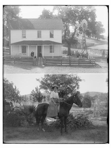 The two-story home of Nathaniel C. Carter on his Willow Dale estate in San Gabriel (now San Marino, California), with a long porch and a garden bordered with a picket fence and rows of grape vines in front of it. A man and a woman stand on porch, a woman on horseback is near the side of house, and a cat rests near the driveway.