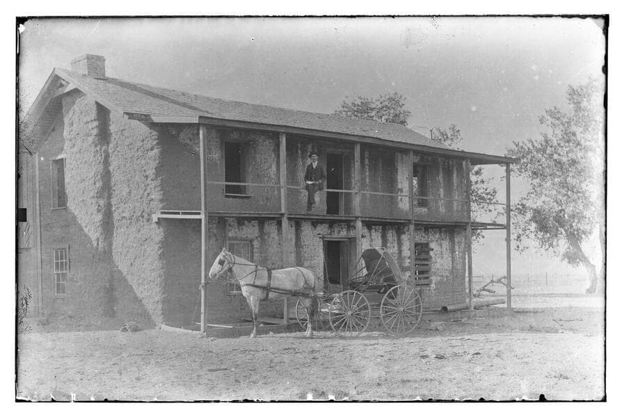 A large two-story adobe building (possibly a house) with balcony on second floor. A bicycle leans against a wall and chickens are in the yard.