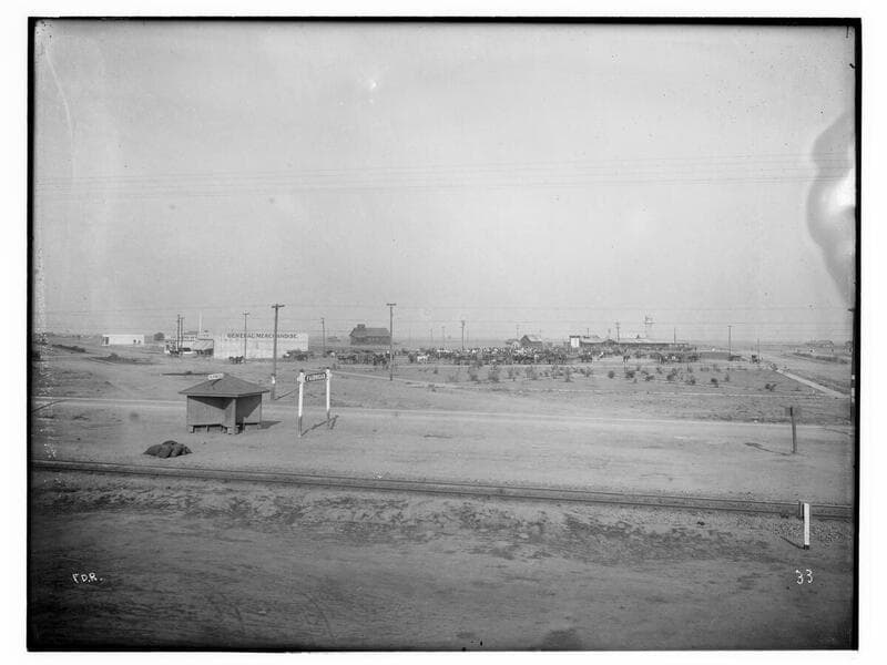 Glass plate with a view of the railroad and Fairmead Inn. There are dozens of automobiles and horse drawn carts parked in front of the inn, which has a long white table surrounded by people on its left. There is a sign with the town's name alongside the railroad, and a general merchandise store and land office near the left edge of the image.