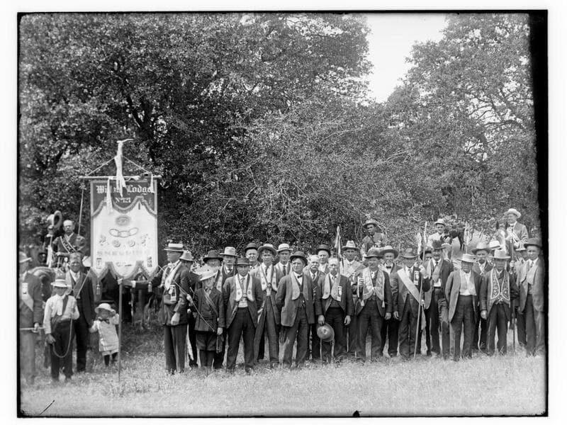 Glass plate with a group portrait of about 40 members of the Lafayette Lodge No. 65 of La Grange, a branch of the Odd Fellows, taken in a field with trees in the background. The men are wearing ceremonial vestments over their suits, and four men are mounted on horses. A man in the center is holding the lodge's standard and is flanked by two boys in white suits holding strings to steady the banner.