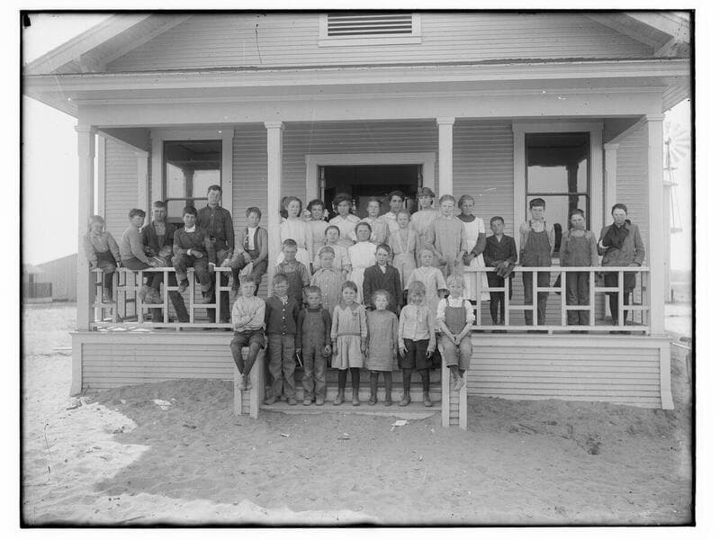 Glass plate with a group portrait of school children in front of the one room Hopeton School in Merced County. There are six young boys and one older boy, two young girls, one older girl, and one young woman who may be the teacher(?), standing in two rows. Two boys in the front row are not wearing shoes. There is a wide porch in front of the school with a dog lying next to the building on the left.