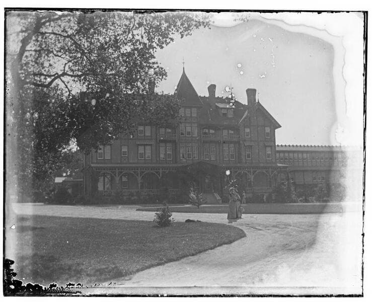 A view of the Hotel Del Monte, located near Monterey, California. There is a covered porch running the width of the building and a small tower just right of the center. The lawn in front is planted with low shrubs and trees.