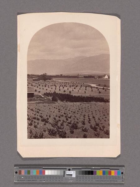 Landscape view of vineyards, orchards, ranch buildings, and houses in Pasadena, California. A tree line at the horizon and mountains in the far distance.