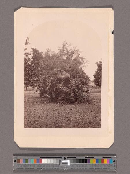 A large rosebush grows around a dead tree trunk on the Los Robles estate owned by General George Stoneman in San Gabriel (now San Marino, California). Trees planted in rows are on either side of the bush.
