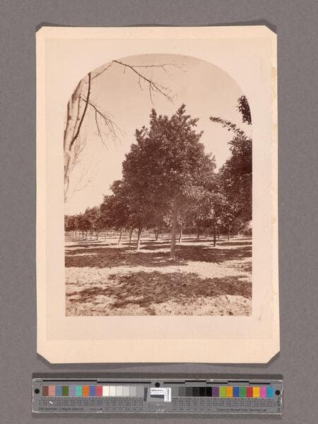 A view of orange groves on the San Marino Ranch. The orange trees are planted in rows, and stretch off into the distance, where the Shorb house is just visible on the hill in the center.