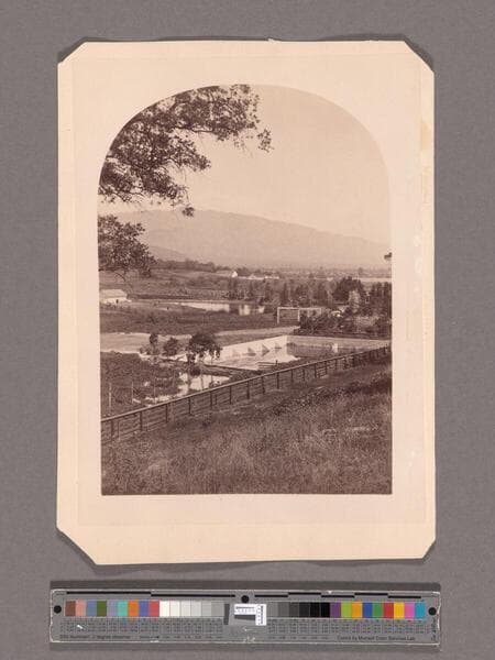 A makeshift dwelling, part thatched straw, part wood and blankets, sits in a flat clearing on the Santa Anita Ranch owned by Elias Jackson "Lucky" Baldwin in San Gabriel (now chiefly in Arcadia, California). Another small dwelling sits amid trees to the left, and at the back of the clearing is a wood frame bell-tower.