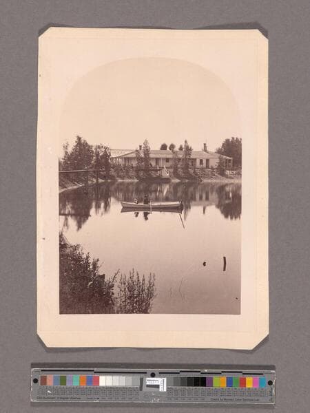A rowboat grounded on the shoreline of a lake with calm water on the Santa Anita Ranch owned by Elias Jackson "Lucky" Baldwin in San Gabriel (now chiefly in Arcadia, California). San Gabriel Mountains in the distance.