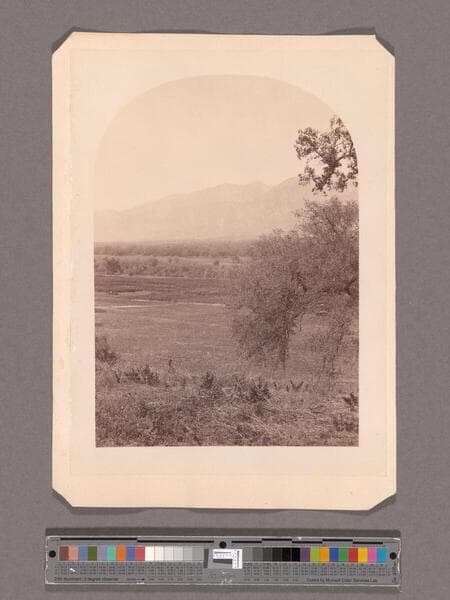 A makeshift dwelling, part thatched straw, part wood and blankets, sits in a flat clearing on the Santa Anita Ranch owned by Elias Jackson "Lucky" Baldwin in San Gabriel (now chiefly in Arcadia, California). Another small dwelling sits amid trees to the left, and at the back of the clearing is a wood frame bell-tower.