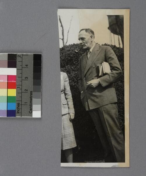 Profile portrait of Edwin Powell Hubble, wearing a suit and tie. Photographer: Jay Barrie. Note on verso, in the hand of Grace (Burke) Hubble: "EPH about Jan 1950".