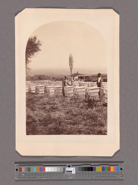 Seen from a distance, rows of white hive boxes, and two small buildings related to the beekeeping business of the Sierra Madre Villa hotel in San Gabriel (now Sierra Madre, California). In the foreground, there is a rocky hill covered with scrub brush and the San Gabriel Mountains in the background.