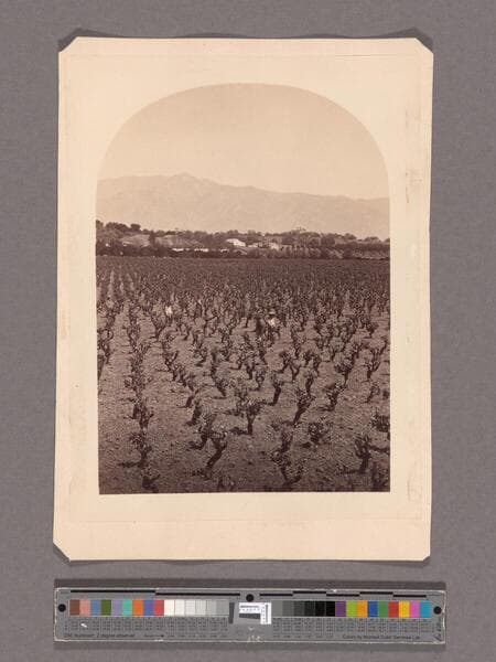Landscape view of numerous rows of grape vines of the Lake Vineyard owned by Benjamin Davis Wilson in San Gabriel (now mainly part of San Marino, California). Three men in hats stand in different areas of the vineyard near the foreground, and hills and the San Gabriel Mountains are visible in the background.