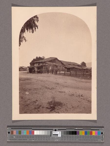 Landscape view of the original site of San Gabriel Mission, in the San Gabriel Valley, California, with the ruins of adobe building visible.