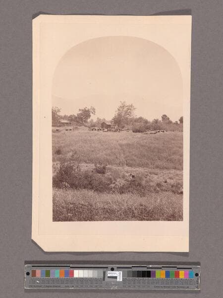 Seen from a distance, rows of hive boxes and two outbuildings of a beekeeping ranch, with a grassy meadow in the foreground, in San Gabriel (presumably now in the San Gabriel Mountain foothills around Sierra Madre, California).