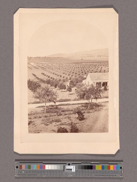 Rows of young trees stretching from the foreground to the horizon as seen from the Lake Vineyard House in Pasadena, California. A small one-story building sits to the right next to an irrigation reservoir.