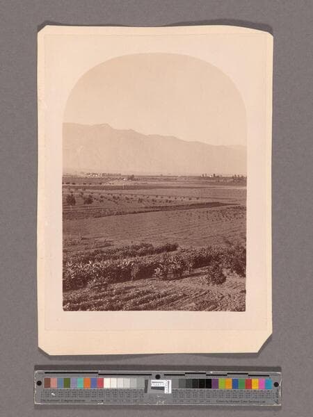 Scenic view of continuous agricultural fields in Pasadena, California, with the San Gabriel Mountains in the distance, as seen from the property of Jeanne C. Carr and Dr. Ezra Carr (presumably their Carmelita estate).