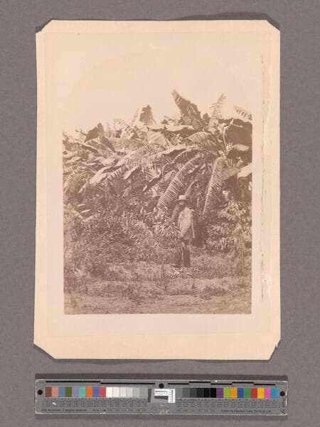 A man and a little girl stand against a wooden fence that surrounds a small outbuilding, where three more people also stand. To the left are two banana trees as well as other trees. The image may depict some of the nursery and orchard grounds of James C. Wallace of San Gabriel, California.