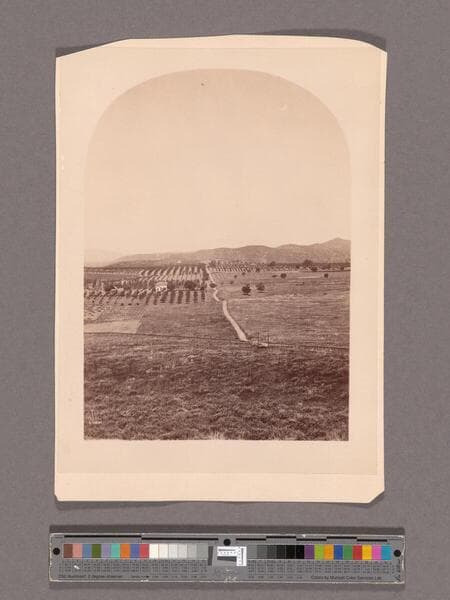 A narrow road runs through an expanse of flat empty land, young orchards, and vineyards around Pasadena, California, as seen from Bacon's Hill, located on the (modern-day) border between Pasadena and South Pasadena. A two-story residence sits near orchard to the left of road.