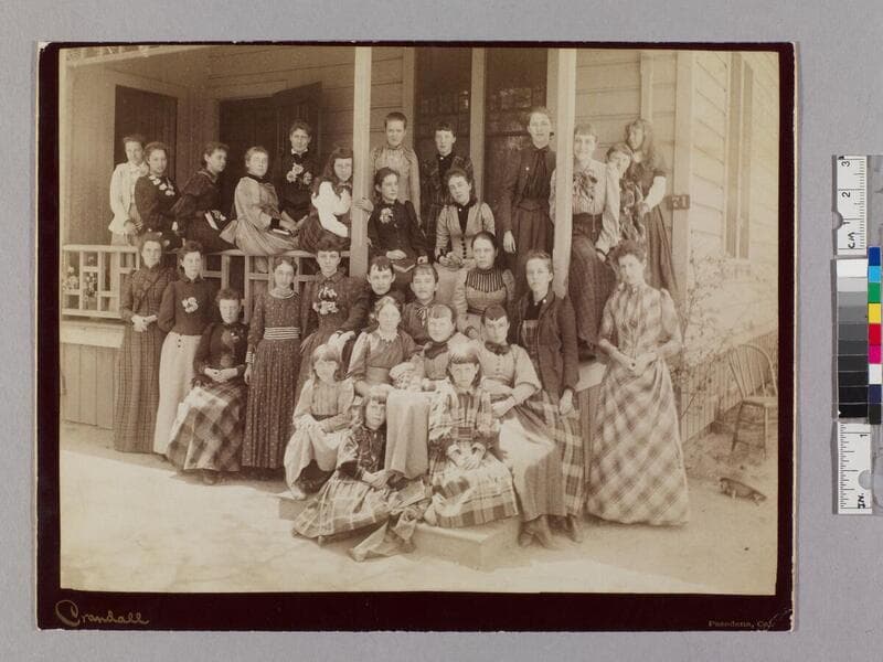 Women and girls of varying ages gather on and around the porch of a small building. The house number "71" is affixed to the right side of house.