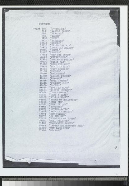 85 album pages, each containing an 8 x 10-inch photograph depicting sets, performers, and concepts from live variety stage shows performed before feature films. These shows, known as "Ideas," were produced by the Los Angeles-based theatrical production team of Fanchon and Marco. The photographs document stages, often with ornate set designs, rehearsals, dance and musical numbers, costumes, and group and single portraits of dancers, musicians, and actors for shows performed from around 1931. Photographers chiefly unidentified; a photographs for "Ted Lewis" include the imprint of the White Studio of New York (page 66). The photographs were originally housed in a custom binder and comprise volume 9 of a 16-volume set that served as a visual inventory for hundreds of Fanchon & Marco performances.