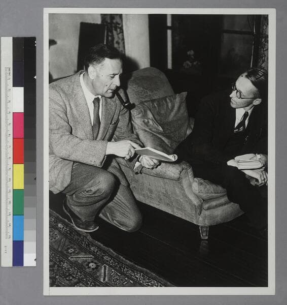 Edwin Powell Hubble sitting in Hubble's living room, below portrait of Sir Arthur Stanley Eddington, by Augustus John. Note in the hand of Grace (Burke) Hubble: "Collier's Palomar issue."