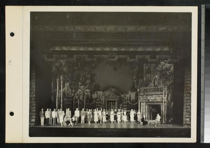 87 album pages, each containing an 8 x 10-inch photograph depicting sets, performers, and concepts from live variety stage shows performed before feature films. These shows, known as "Ideas," were produced by the Los Angeles-based theatrical production team of Fanchon and Marco. The photographs document stages, often with ornate set designs, rehearsals, dance and musical numbers, costumes, and group and single portraits of dancers, musicians, and actors for shows performed from approximately 1931 to 1932. Some of the photographs include imprints for Archer's Art Shop of Los Angeles and Archer's Studio of Hollywood, California. The photographs were originally housed in a custom binder and comprise volume 8 of a 16-volume set that served as a visual inventory for hundreds of Fanchon & Marco performances.