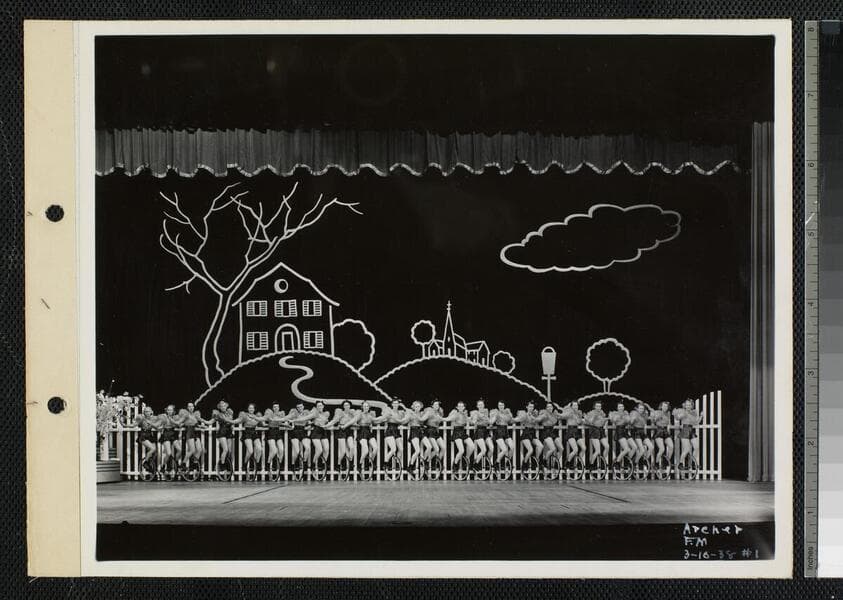 85 album pages, each containing an 8 x 10-inch photograph depicting sets, performers, and concepts from live variety stage shows performed before feature films. These shows, known as "Ideas," were produced by the Los Angeles-based theatrical production team of Fanchon and Marco. The photographs document stages, often with ornate set designs, rehearsals, dance and musical numbers, costumes, and group and single portraits of dancers, musicians, and actors for shows performed from around 1931. Photographers chiefly unidentified; a photographs for "Ted Lewis" include the imprint of the White Studio of New York (page 66). The photographs were originally housed in a custom binder and comprise volume 9 of a 16-volume set that served as a visual inventory for hundreds of Fanchon & Marco performances.