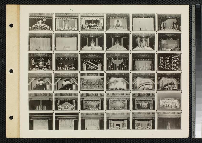 29 album pages, each with thirty-six or more thumbnail photographs per page, depicting sets, performers, and concepts from live variety stage shows performed before feature films. These shows, known as "Ideas," were produced by the Los Angeles-based theatrical production team of Fanchon and Marco. The photographs document stages, often with ornate set designs, rehearsals, dance and musical numbers, costumes, and group and single portraits of dancers, musicians, and actors for shows performed from the late 1920s to the 1930s. The photographs were originally housed in a custom binder and comprise volume 16 of a 16-volume set that served as a visual inventory for hundreds of Fanchon & Marco performances. The thumbnails appear primarily to duplicate images found in the other volumes, in reverse order, with the last thumbnails on page 29 corresponding to the Circus images on page 97 of photCL 487 vol 2, and earlier pages corresponding to later volumes. The volume duplicates the images found in pages 1-29 of photCL 487 vol 15.