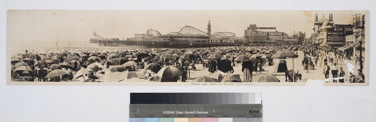 Crowds at beach, Lick Pier and Ocean Park Pier, Venice and Santa Monica