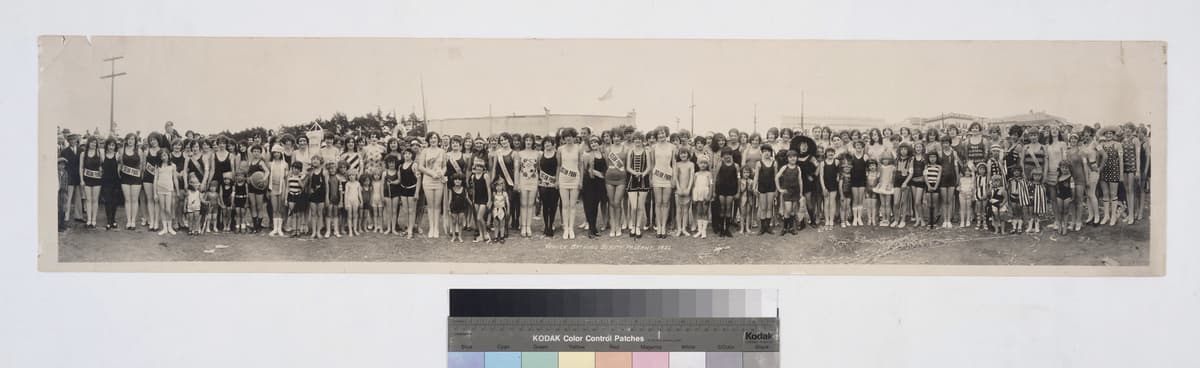 Panoramic view of crowd of people standing on the Santa Monica Pier, with amusement rides behind them. Includes beauty contestants, musical bands, spectators and others. Automobiles in a parking lot, a roller coaster, and the bluffs above the beach can be seen in the background. Included on sashes and the young women's bathing suits are lettering including "Miss California Beautifier, W.B. Blakeley" and "Sea Breeze."