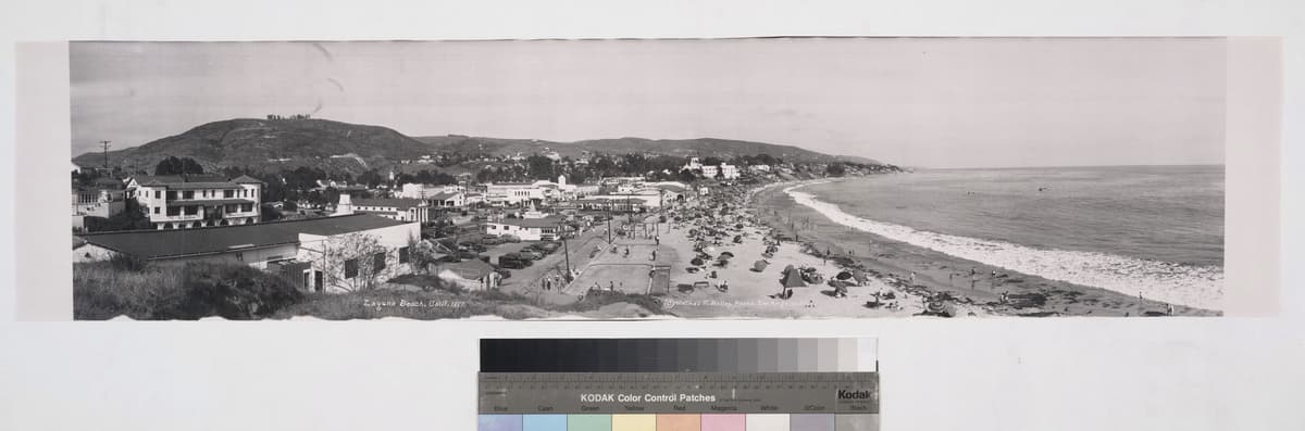Panoramic view of Laguna Beach showing the restaurant "Victor Hugo Inn" on the cliffs above at far left. Hotel Laguna is on the beach next to houses in the hills, the Laguna Beach dance hall and people on the beach.