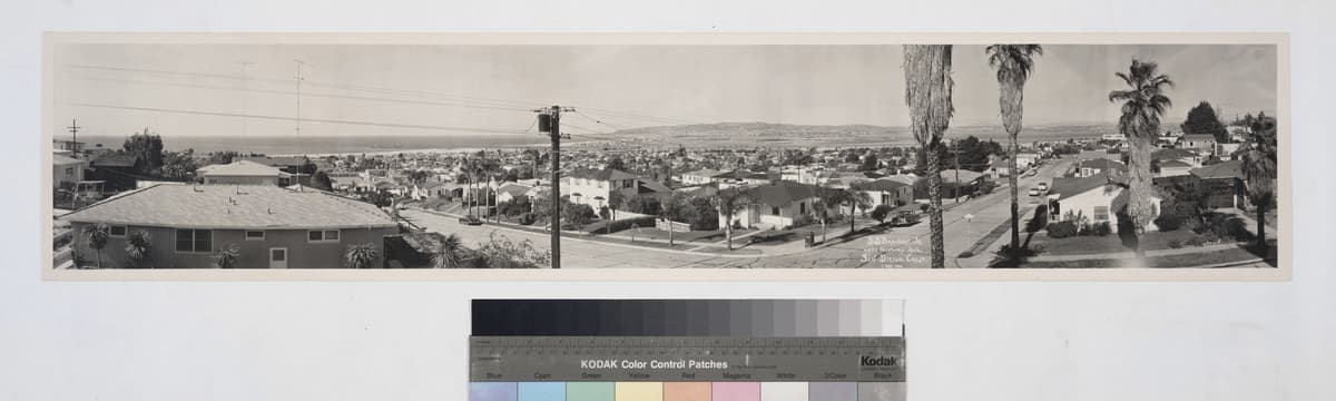 View of houses on Second Street (in the foreground) and Olive Street (running perpendicular at upper right) in the Bunker Hill neighborhood of downtown Los Angeles, California. Visible residences on Second Street include the matching one-story houses in the foreground: 426 West Second Street (with horse and wagon to its left) and, at right, 428 West Second Street (208 South Olive Street is visible directly next to 428 West Second). Visible residences on Olive Street include: 227 South Olive Street on the hill at far upper right with 235 South Olive Street directly to the left; across the street, towards center is 226 South Olive Street and the duplex behind it (with balconies running the length of both stories) is 230/232 South Olive Street.
