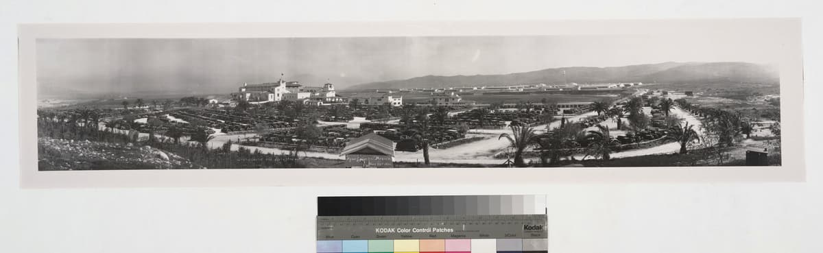 - Panoramic view of Agua Caliente horse racing track in Tijuana, Mexico, showing parking lot full of automobiles, grandstand, and buildings and hills behind track.