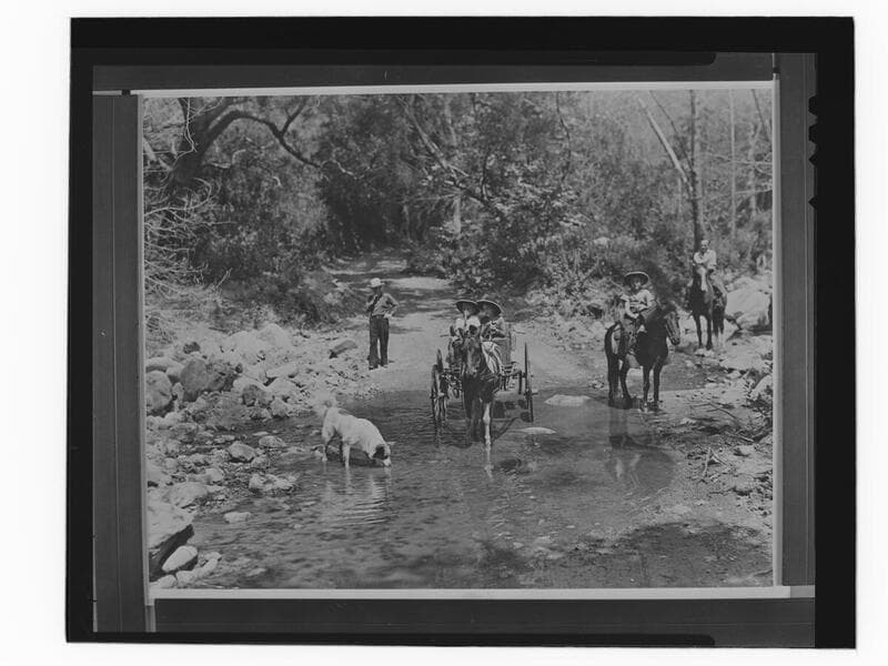 Image of Fred and Florence Roberts sitting in a horse drawn buggy with their sons Jim and Jack Roberts on either side on horseback, in Solstice Canyon, Malibu, California.