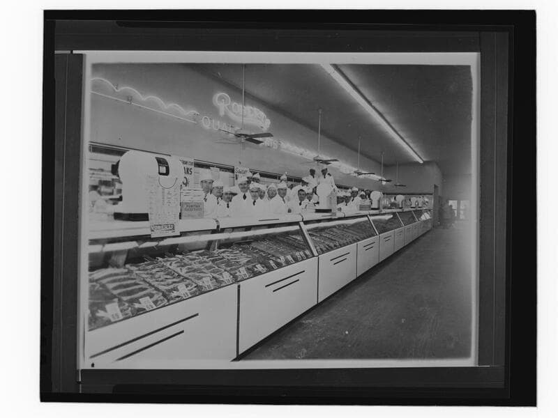 Meat counter and butchers at Roberts Market, West Los Angeles