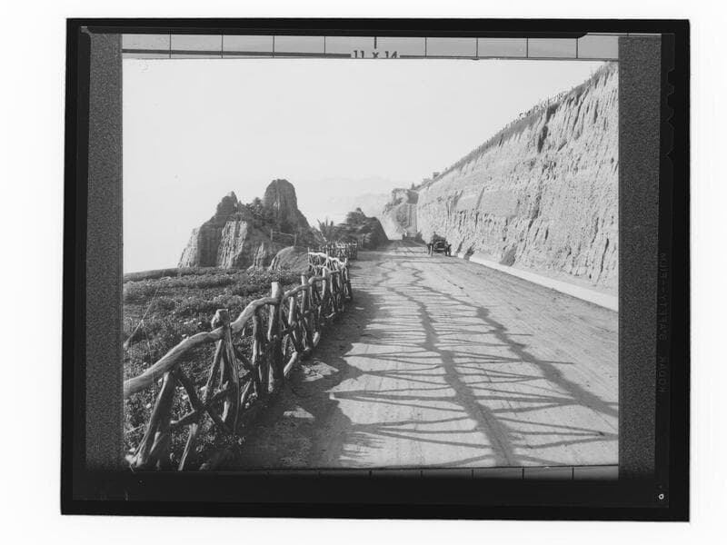 Image of the California Incline road leading down to the coastal highway below the cliffs of Palisades Park in Santa Monica, California. The rustic wood branch fence is seen at the top of the bluffs and along the road. The Long Wharf is in the distance and a few buildings are on the sand, near the water.