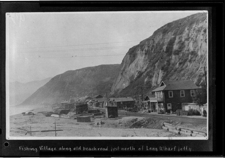 Image of a Japanese fishing village located along the old Beach Road and north of the Long Wharf in Pacific Palisades, California.