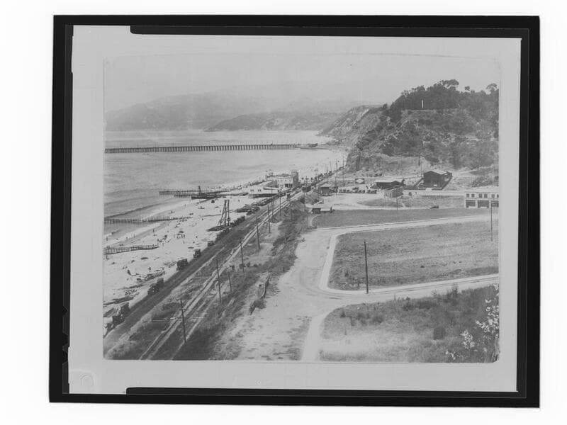 Image of the cliffs and beach looking south from Santa Monica Canyon with the Arcadia Hotel in distance, and the Southern Pacific Railroad tracks running next to the Beach Road in Santa Monica, California. The remains of the Los Angeles and Independence Wharf are visible at upper right center of image.