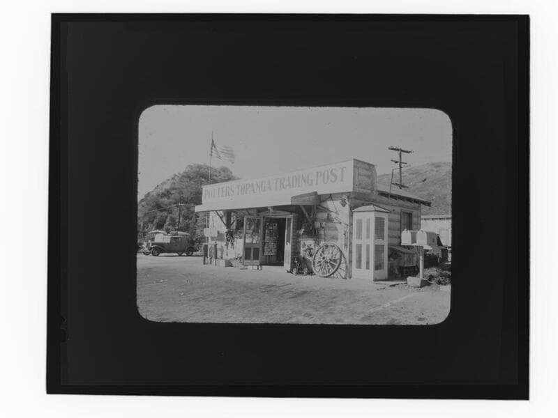 Image of automobiles parked at the summit of Topanga Canyon Boulevard in Topanga, California, with a sign visible for "Arrowhead Ginger Ale."