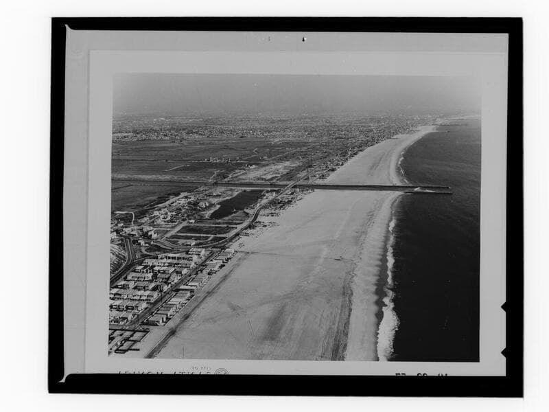 Aerial view of part of Playa del Rey, in Los Angeles, California, showing the beach at upper left.