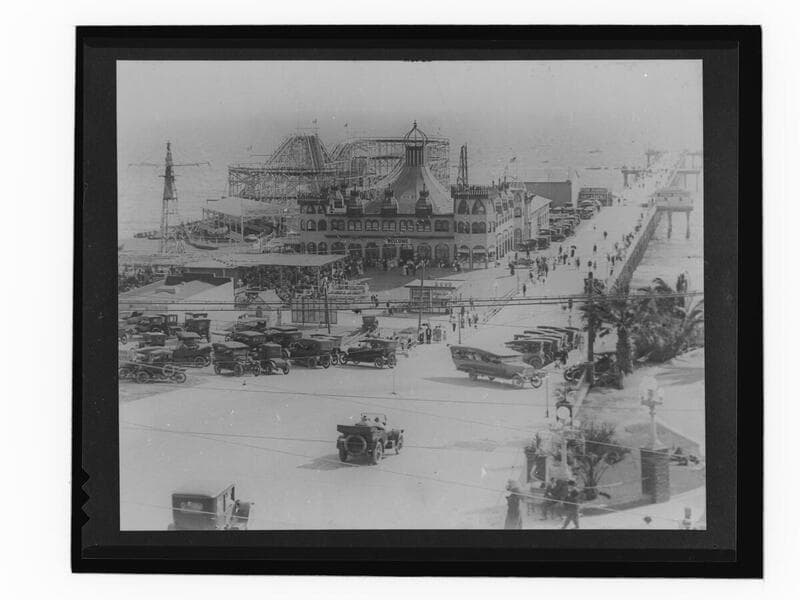 Image of the Pacific Electric Railway Ocean Avenue depot in the foreground, with a streetcar marked "Venice," and the Looff Pleasure Pier, Santa Monica Municipal Pier and beach in distance in Santa Monica, California. The Looff Hippodrome (with "Welcome" sign), "Bowling and Billiards" building, the Blue Streak Racer roller coaster, and Aeroscope rides are visible on the pleasure pier.