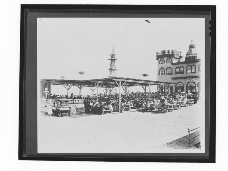Image of people in the picnic area next to the bandstand at the Looff Pleasure Pier in Santa Monica, California. The Blue Streak Racer roller coaster, Aeroscope ride, and Looff Hippodrome (with "Welcome" and "Picnic Tables End of Pier" signs) are in the background and an electric tram can be seen at left. The picnic area has sign "Coffee Coupons Good Here."
