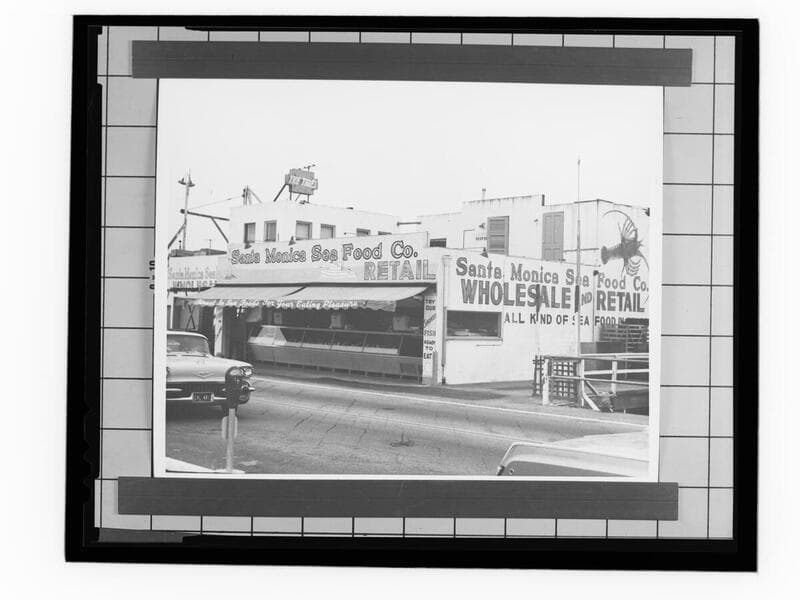 Image of people standing on the Santa Monica Municipal Pier in front of shops while peering over a railing at the ocean and beach in Santa Monica, California. Signs for stores on the pier include "Sea Food Grotto," "Chesapeake Cafe," "Fishing Tackle," and "ice cream bar."