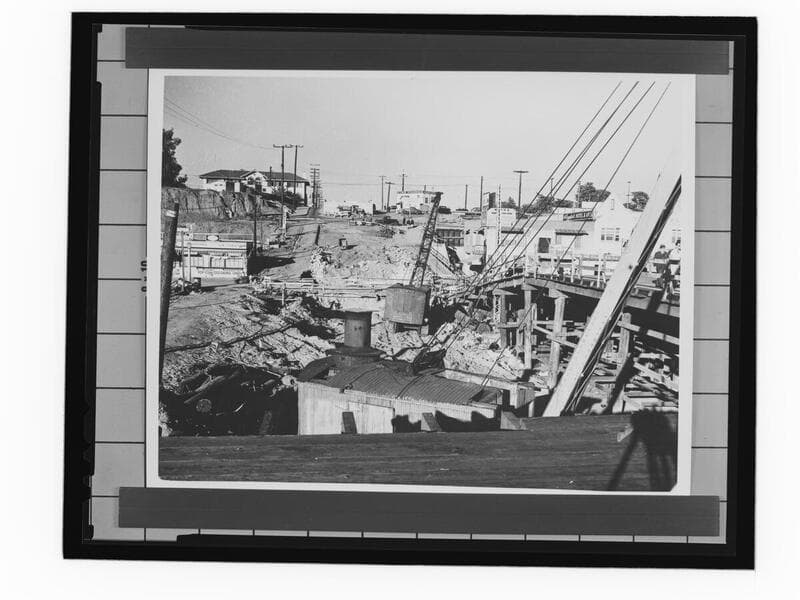 Image from the Santa Monica Pier in Santa Monica, California, looking towards Colorado Avenue during construction. Visible restaurant signs include "Sandy's" "Evan's Peanuts & Pop Corn," "Drink Coca-Cola," "Fish Dinners, Joe's Cafe" and "Fishermen's Market."