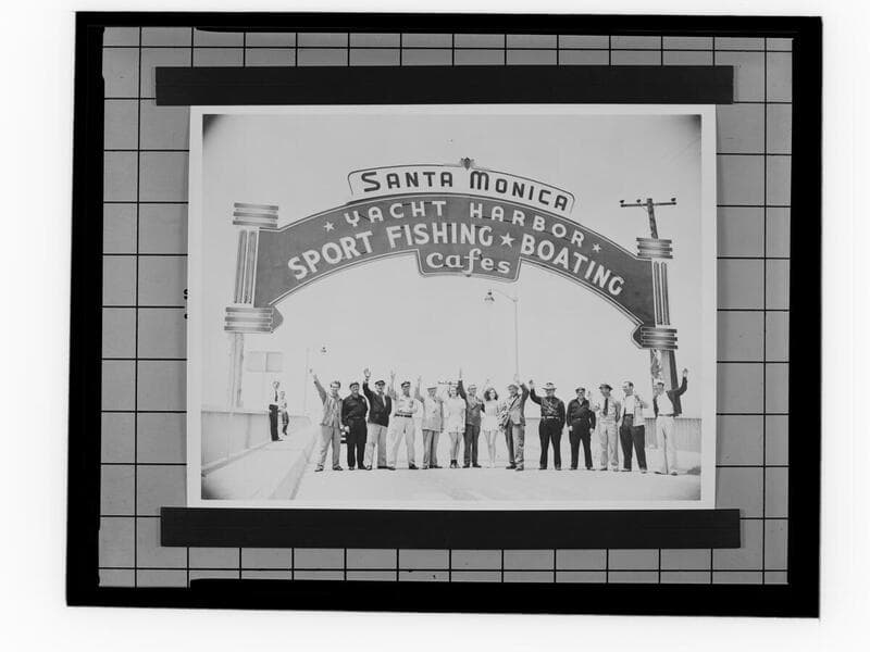 Image of men standing in front of a sport fishing bait and tackle shop on the Santa Monica Municipal Pier in Santa Monica, California. Signs painted on the shop read "Santa Monica Sport Fishing Inc. Bait and Tackle," "A complete line of tackle," and "Rent Rods, Boat Tickets."