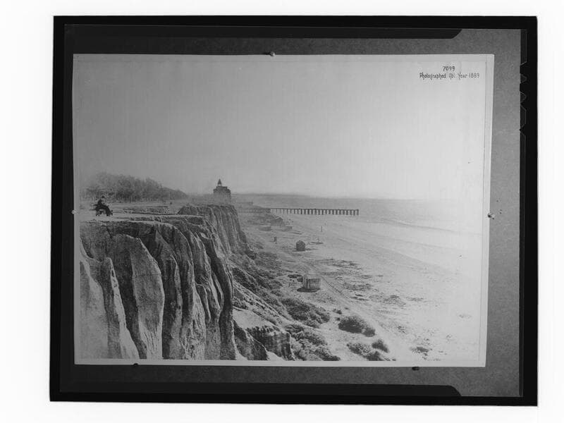 Image of the alluvial bluffs of Palisades Park with the Arcadia Hotel in the distance at center and the North Beach Bath House at left in Santa Monica, California. A sign painted over the north entrance to the North Beach Bath House salt water plunge reads "Plunge" and the east facing back wall reads "North Beach Bath House." Train tracks are visible below the cliffs, behind the bathhouse and the North Beach Bath House Pier is seen at far left.