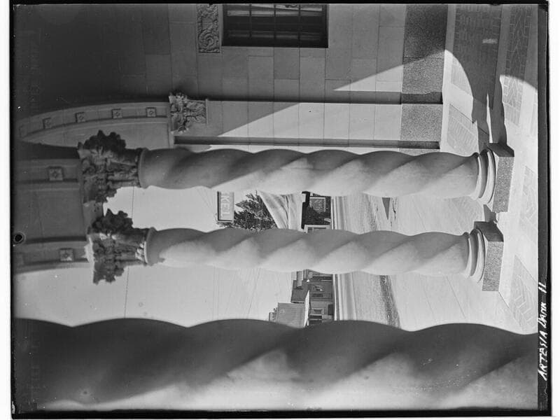 Close-up view of the front doors and arches of the First National Bank on the northwest corner of 187th Street and Pioneer Boulevard in Artesia, California.