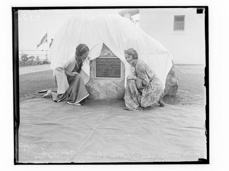 Image of Madie D. Brown, a California State Park Commissioner, sitting next to a boulder covered with a sheet unveiling a tablet beginning "California State Beach, Dedicated the 8th day of July 1931, by the honorable James Rolph, Jr., Governor." The photograph was taken before the dedication ceremonies opening the beach-side park in Santa Monica, California, on July 8, 1931.